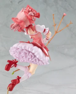 This Madoka Kaname 1/8 scale figure is a perfect rendition of a key visual of Madoka used for the Puella Magi Madoka Magica movies Beginnings and Eternal. Place this blushing Madoka figure on your desk or in your collector’s case and she will look like she’s jumping in midair! Her pink twintails and bows even further express such movement! Magnificently painted and molded, her deep red shoes, rose-adorned bow and arrow, and ruffled skirt are also extremely impressive.