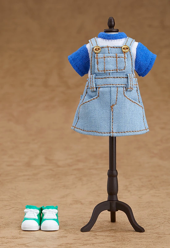 From Good Smile Company and designed by Mieko Akimoto comes this Nendoroid Doll Overall Skirt Outfit Set! It includes a light denim overalls skirt, a T-shirt with blue sleeves and collar, white socks, white underwear, and green sneakers with magnets to securely attach to magnetic Nendoroid Doll bases. Give your favorite Nendoroid Doll a playful new look!