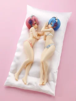 From Kadokawa and sculpted by Layup (Kirukiru) comes this Sleeping Together 1/7 scale figure of Rem from Re:Zero -Starting Life in Another World-. She measures 9.1” and rests on her side on a 10.8” satin bed. You can also display her with the included bed sheet, pillow, or bath towel. Her blue and white lingerie has been carefully detailed down to its petite bows and lace design. Her soft, slim physique has also been faithfully recreated with quality shading and her gentle, smiling expression is super cute. She can be displayed on her own or together with Ram (sold separately). When displayed together the two hold hands! Add her to your collection as a bedside figure~