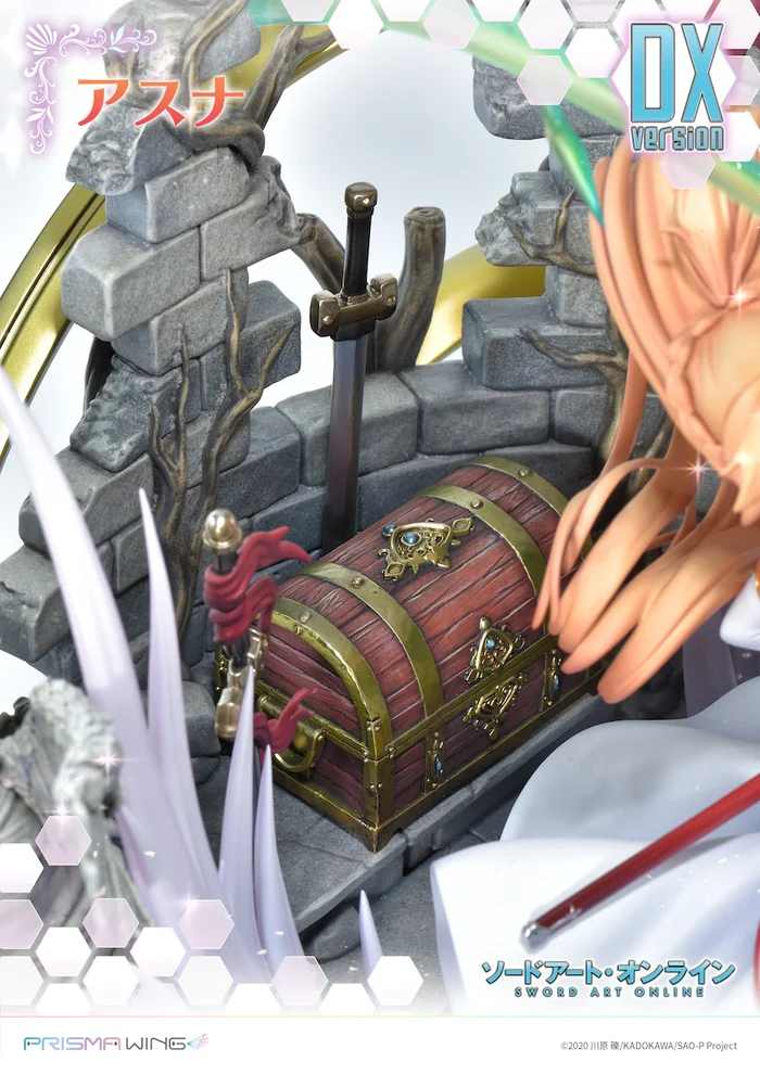 This deluxe version of the figure immerses Asuna in a weighty polystone base dripping with extra details! A translucent arch effect further brings to life the raw power of the Flash’s attack. Translucent blue effect parts that glow with LED functionality impress the digitization of the game world that Asuna is trapped in. A cloaked statue, a brick wall, and a coveted treasure chest surround Asuna – these elements and more combine for us to touch and experience SAO‘s high fantasy in a whole new way!