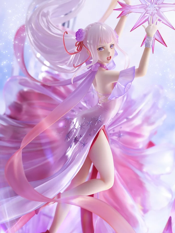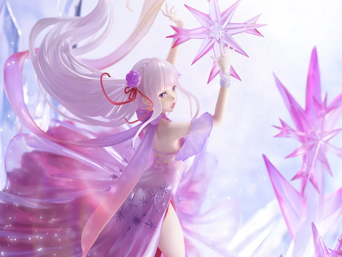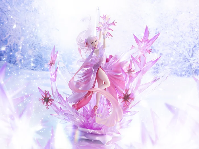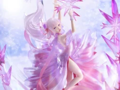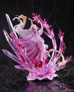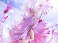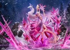 Design Coco and eStream have created a wondrous interpretation of Re:Zero‘s Emilia draped in a magenta dress. The piece truly exemplifies just what a powerhouse Emilia is, as she manifests razor-sharp crystal snowflakes made of similar magenta hues combined with translucent crystal formations underneath her. These features form the figure’s unique base. Emilia-tan’s powers are just as beautiful as they are deadly!