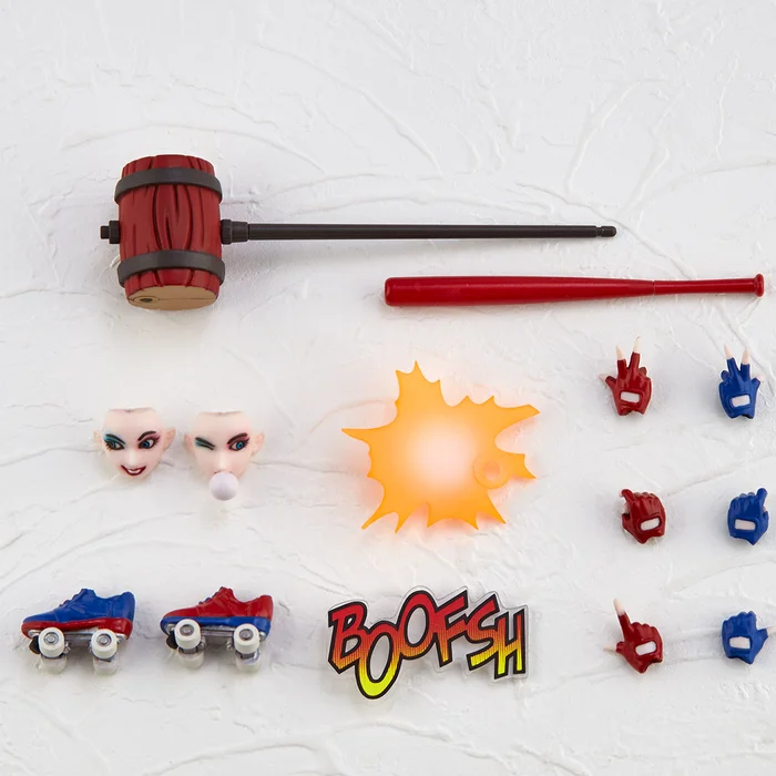 She comes with three face plates (normal, intrigue, and bubble gum; each with movable eyes), a bat, a hammer, sound effect parts, and roller skates that you can swap her boots with! Have fun displaying her in all the ways you can think up in your collection!