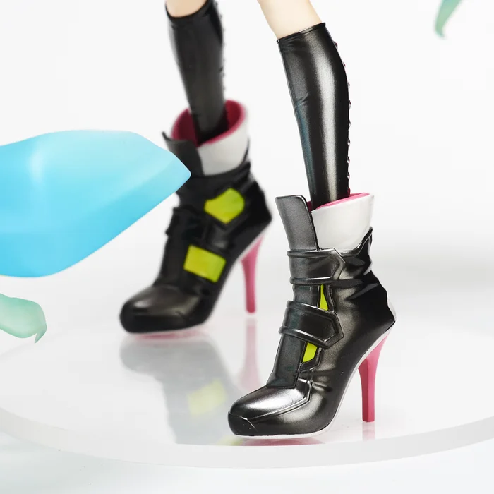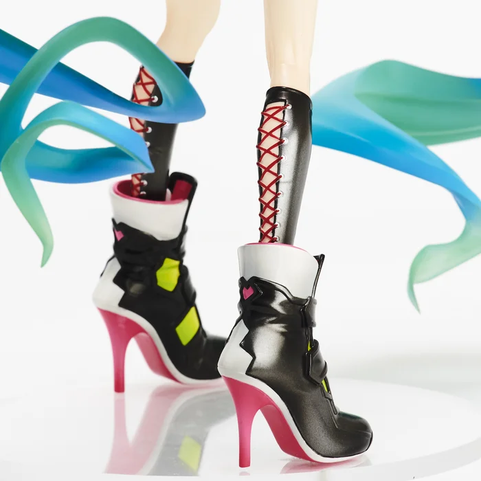 Tokyo Otaku Mode, in collaboration with the top-tier figure manufacturer STRONGER, is proud to present the official Hatsune Miku: LAM Rock Singer Ver. 1/7 Scale Figure! Designed by famed provocative illustrator LAM, Miku-chan is a true punk rock gem to behold. So much love was poured into the making of this 11″ tall figure, from the minute sticker and string details on her killer black and pink guitar to the cute tattoo behind her right leg. Miku’s turquoise twintails hypnotizingly swirl on both sides of her body, taking a more jagged shape than usual, like a representation of the electric rock sounds flowing through her. Her heels are a contemporary mix of white, black, yellow, and pink. Her pupils are multi-colored, distinct to LAM’s art style. And her black flight jacket is decorated just like the