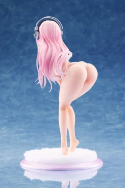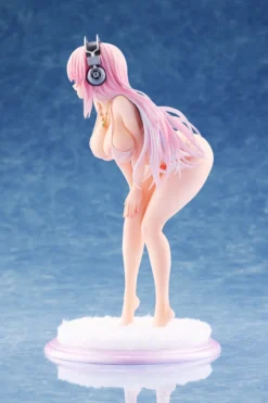 From WAVE and sculpted by Curve Models comes this DreamTech 1/7 scale figure of Super Sonico. Measuring 8.5″, she is bent over with her hands resting on her knees in a pose that accentuates all her curves while wearing a pale pink string bikini that barely covers her up. Highlights include her cleanly painted purple pink eyes, delicate green guitar pendant on a golden chain around her neck, and her pastel pink to baby blue ombre hair that frames her blushed, smiling face and flows down her back. Attention to detail was also spent on her silver and black headphones which have a realistic appearance. Comes with a pink and white fluff base to display her on. Add this special Super Sonico to your collection!